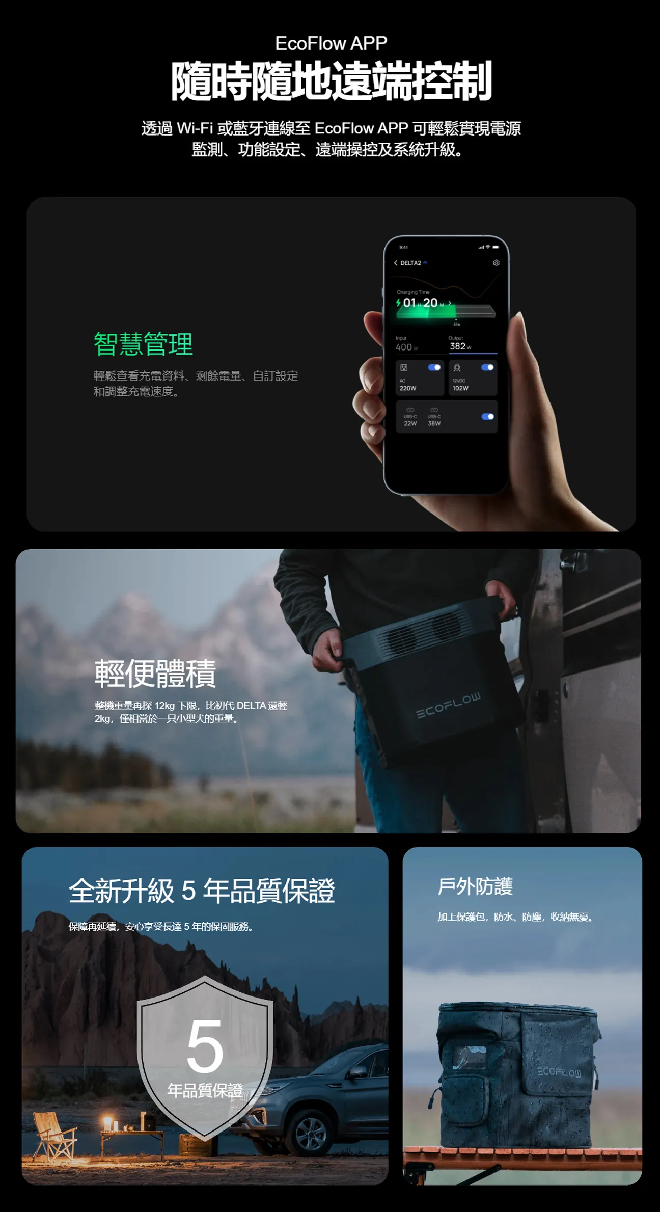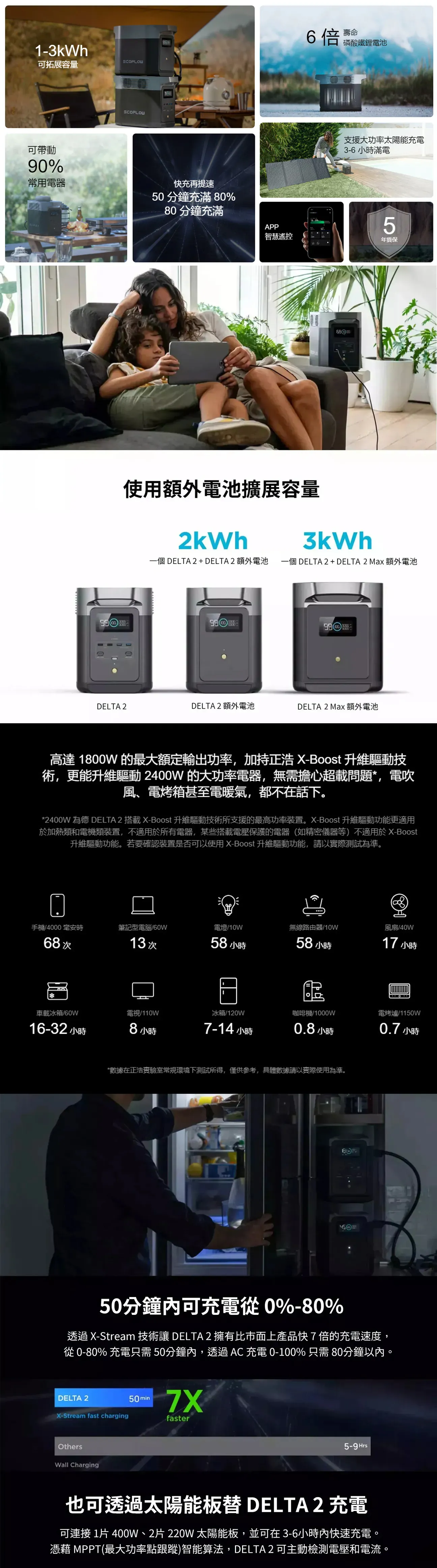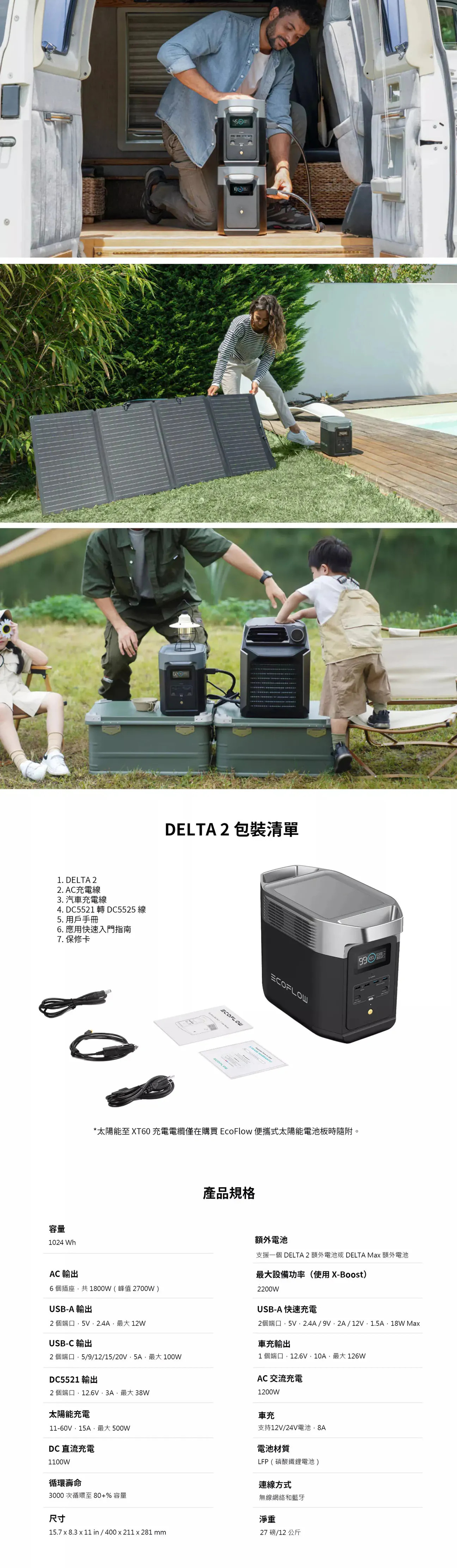 • 電池容量1024Wh,搭配  DELTA 2 額外電池以達到 2048Wh